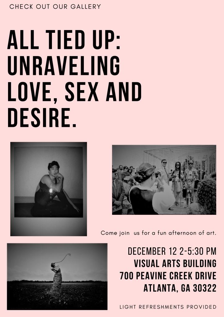 The student-artists of my WGSS Mellon Funded Love-Sex-Desire class, present the art exhibit “All Tied Up: Unraveling Love, Sex, and Desire.” All semester student-artists have been studying how art can expose and critique the dominant ideologies that shape the way we love, sex, and desire. In response, they created their own art, which will be exhibited at Emory’s Visual Art Gallery on December 12th from 2:00-5:30 PM. All are welcome! Please share this event widely! More info here.