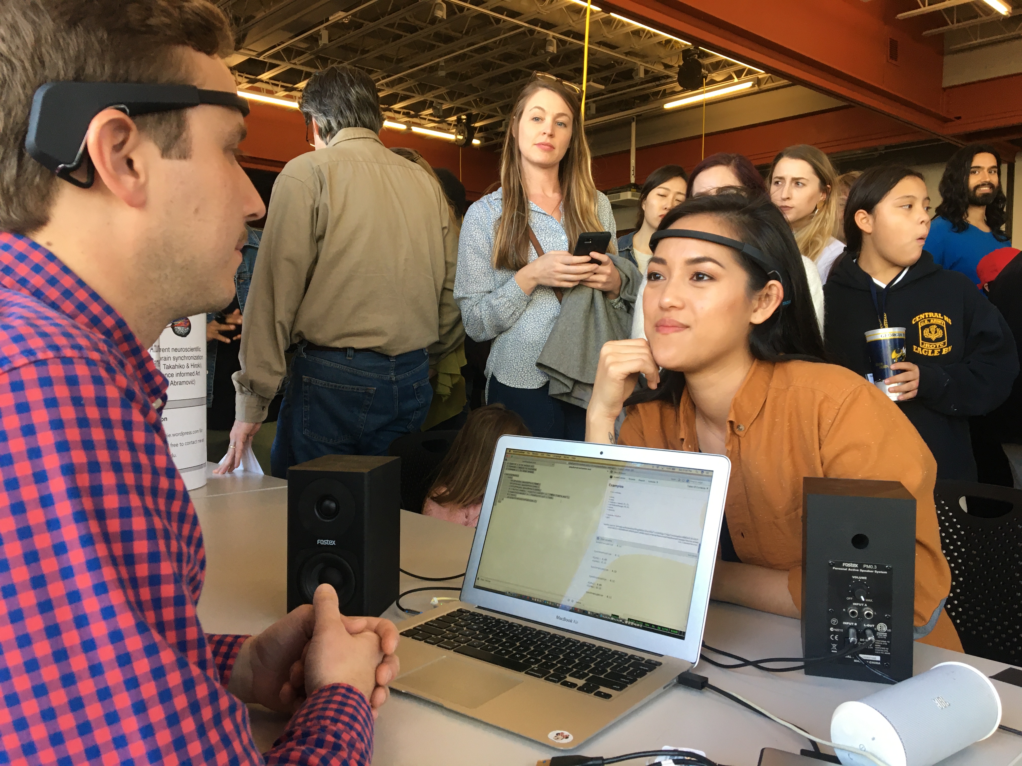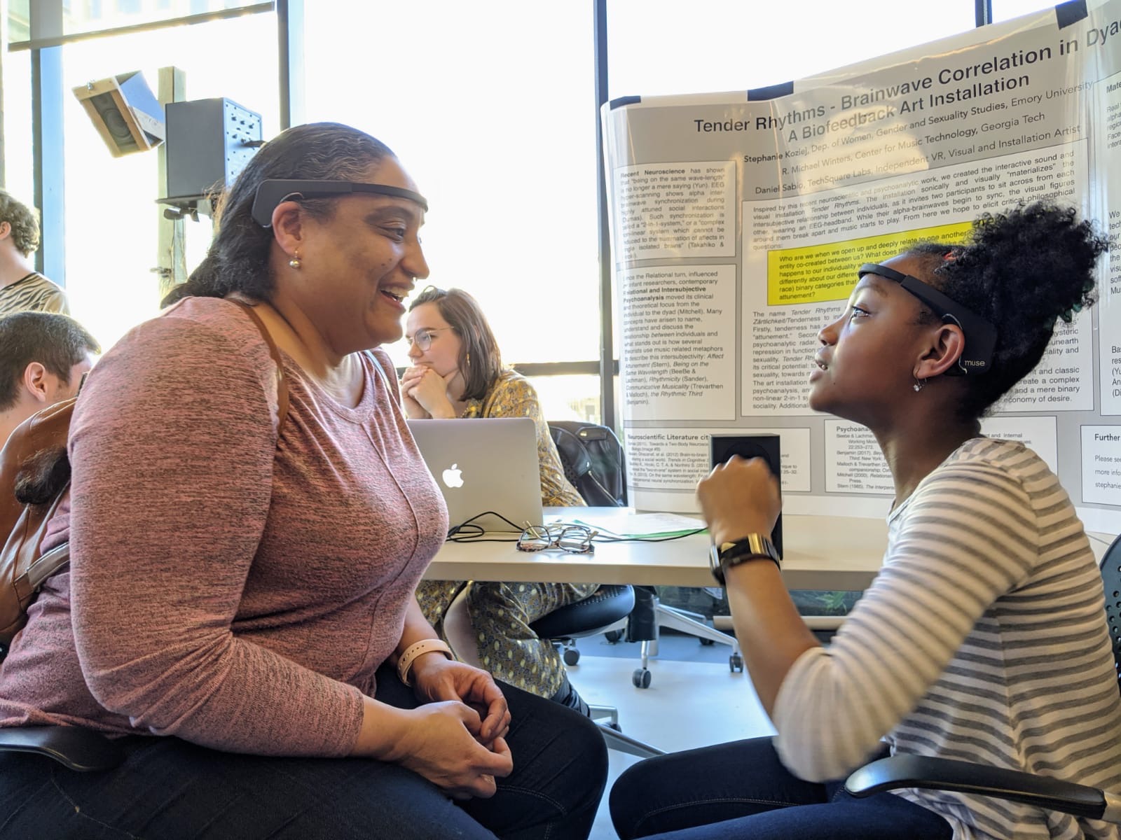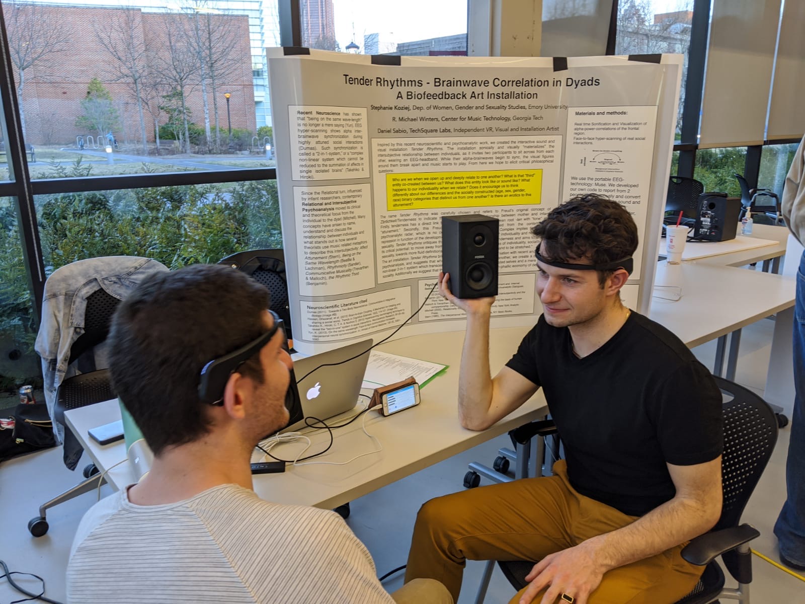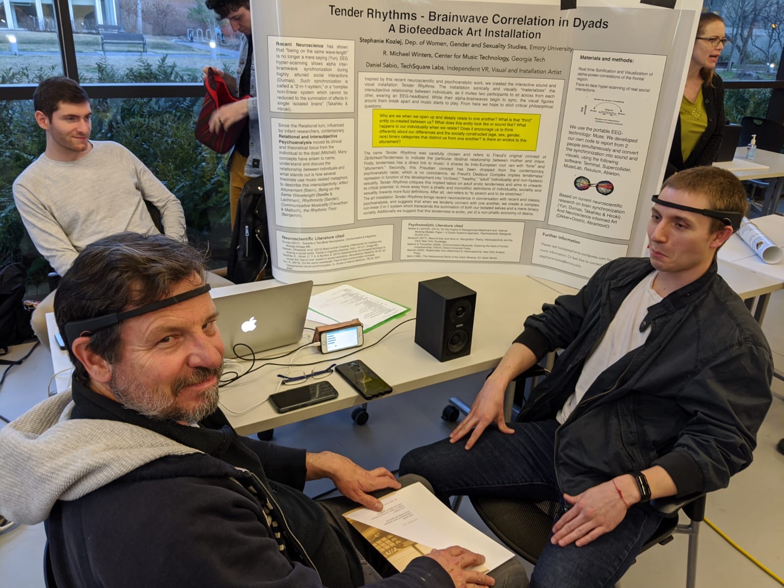 Back in March my collaborator Michael R. Winters, Ph.D. and I premiered our Brain-Computer-Interface (BCI) Installation Tender Rhythms at the Georgia Tech Music, Art and Technology Fair. Many lined up to make music with their brains!