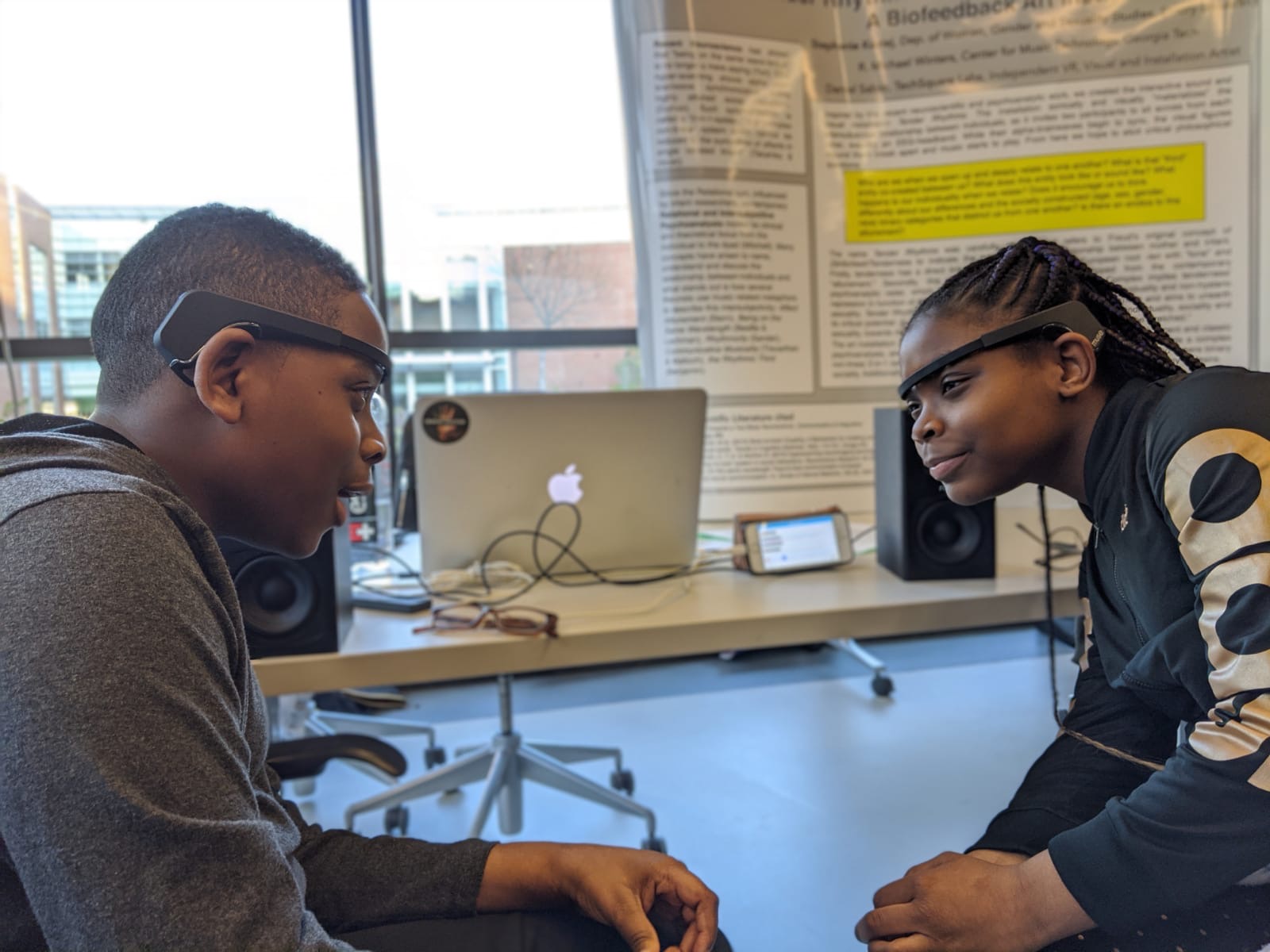 Tender Rhythms is based on recent neuroscientific research which shows that when people deeply connect with each other, their alpha-brainwaves synchronize. Our installation invites two participants to sit down in front of each other while wearing EEG-headsets. When touching, engaging in eye contact or kissing, the brain waves between participants start to synchronize. Our headsets measure this synchronization and our installation translates this into sound. Practically, this means that without a connection there is no music, but once a connection is established music starts to play, increasing in volume as the connection grows stronger.