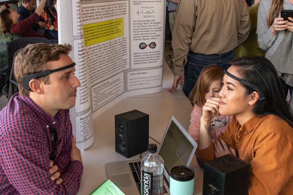 With the help of EEG dual-brain measurements and sonification techniques, our installation translates these tender moments of intense connection into music. Why? Besides it being quite incredible to make music with your brain, Tender Rhythm has an underlaying message.