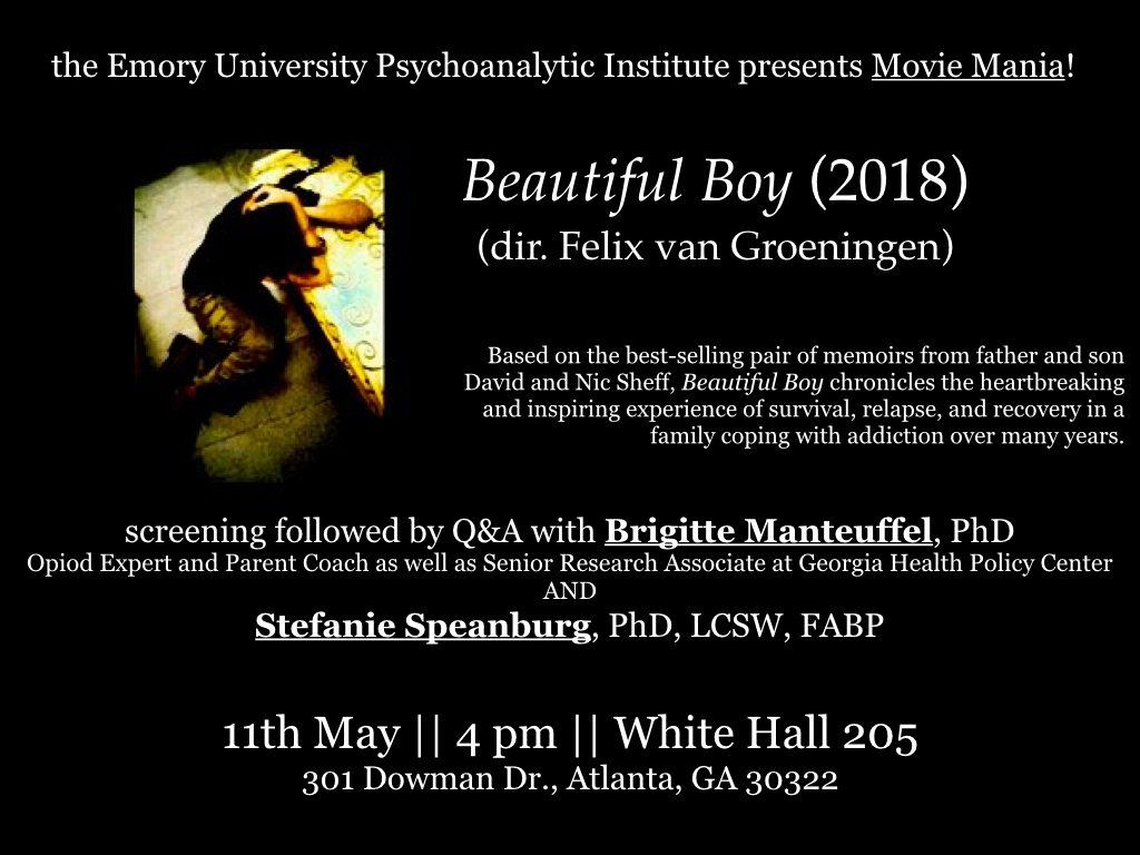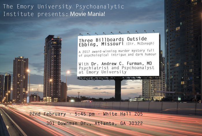 For the past two years I was in charge of Movie Mania, an initiative of Emory University’s Psychoanalytic Institute which brings together analysts, students and local cinema-goers. Since 1992 Movie Mania has maintained an active community presence in the city of Atlanta by organizing movie screenings every year, followed by discussions with local psychoanalysts. The initiative started by a group of newly graduated psychoanalysts from the Institute (including our former director Dr. Robert Paul) with a view to sustain psychoanalytic engagement and development outside the classroom. Over the years and in the hands of many different organizers, Movie Mania has evolved into a relaxed, creative and intellectual space for bridging the gaps between psychoanalysis and the general public.